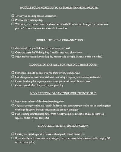 In this self-paced 10 module course, you'll learn valuable tactics when it comes to having an organized photography business, and ultimately, an organized life!